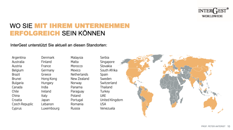 Die InterGest GmbH verfügt über fast fünf Jahrzehnte Erfahrung in der Begleitung von kleinen und mittleren Unternehmen ins Ausland. Hierbei kann sie auf Partner in über 50 Ländern zurückgreifen, mit denen maßgeschneiderte Konzepte unter Berücksichtigung der Rahmenbedingungen im Zielland entwickelt werden können.