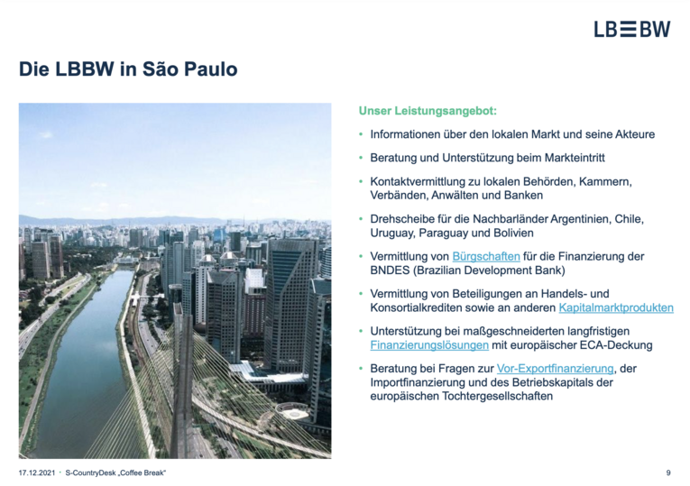 Die Aktivitäten der LBBW sind dabei nicht auf Brasilien beschränkt – die LBBW-Repräsentanz São Paolo fungiert auch als Ansprechpartner für Aktivitäten in den Nachbarländern Argentinien, Bolivien, Chile, Paraguay und Uruguay.
