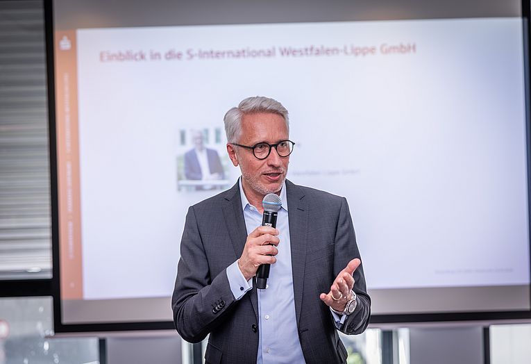 Den inhaltlichen Einstieg übernahm Jürgen Schmieding, Geschäftsführer der S-International Westfalen-Lippe. In seinem Beitrag gab er einen Einblick in die S-International Westfalen-Lippe GmbH und stellte deren Rolle im internationalen Firmenkundengeschäft vor.
