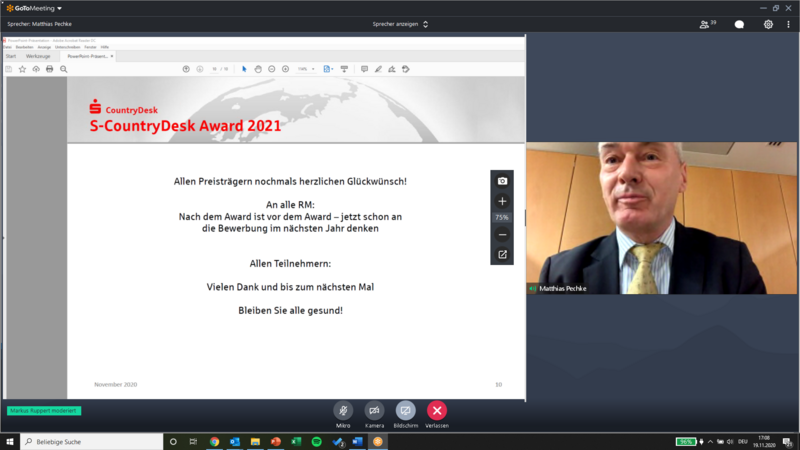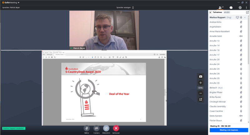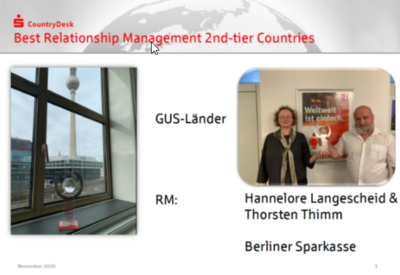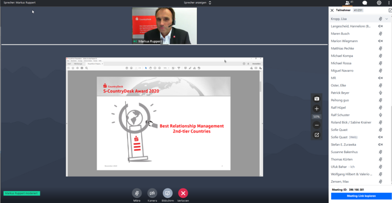 Die Preisverleihung wurde stattdessen virtuell im Rahmen einer Webkonferenz der Relationship Manager durchgeführt, an der am 19.11.2020 über 50 Verantwortliche des Auslandsgeschäfts teilnahmen.