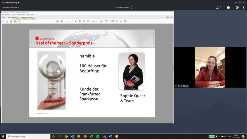 Folglich war auch die Erweiterung des Netzwerks um wichtige Kontakte in Afrika ein positiver Effekt dieses Deals. So wurde die etwas andere Preisverleihung zu einem Erlebnis mit „Wow-Effekt“. Herr Peschke ermutigte alle Beteiligten, auch weiterhin dieses gewisse zusätzliche Engagement einzubringen und man verließ den virtuellen Konferenzraum mit dem Eindruck „S-CountryDesk – More than a Network“!