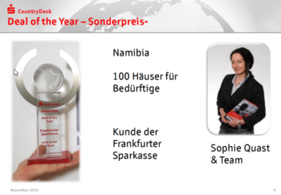 Die Preisträger koordinierten die guten Afrika-Kontakte verschiedener Netzwerkpartner, um einer gemeinnützigen Gesellschaft auf Initiative der Deutschen Wohnungs- und Immobilienwirtschaft die Projektierung des Baus von 100 Häusern für 500 bedürftige Menschen in Windhoek/Namibia zu ermöglichen.