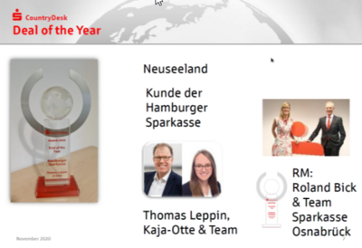 Ein Firmenkunde der Hamburger Sparkasse benötigte ein Geschäftskonto in Neuseeland. Im Zusammenwirken beider Teams konnte die Kontoeröffnung von Deutschland aus schnell und unkompliziert erfolgen. Wegbereiter der guten Kontakte zur lokalen Bank ist der Länderverantwortliche Roland Bick, der im Rahmen seiner privaten Reisen nach Neuseeland und Australien auch regelmäßig Bankpartner vor Ort besucht.