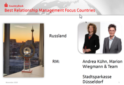 Der Award für „Best Relationship Management Focus Countries“ ging in diesem Jahr an Andrea Kühn und Marion Wiegmann von der Stadtsparkasse Düsseldorf, die zusammen mit ihrem Team Länderverantwortliche für Russland sind.