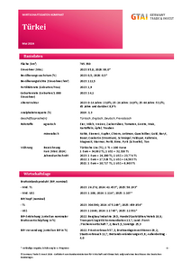 GTAI präsentiert mit der Reihe "Wirtschaftsdaten kompakt" Auskünfte über allgemeine Kennzahlen des Landes wie die Fläche oder das Bevölkerungswachstum. Zudem wird ein wesentlicher Überblick über die wichtigsten Kennzahlen zur Wirtschaftslage, Außenhandel und das geschäftliche Umfeld geliefert. Sehen Sie auch die Statistiken zu den wirtschaftlichen Beziehungen der Türkei mit der EU und Deutschland. Siehe bitte Anlage.